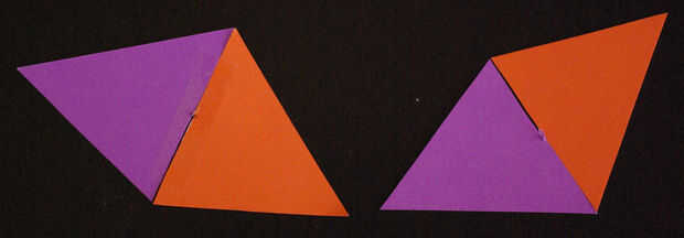 Usando cinta adhesiva transparente, Únete a dos de estos triángulos isósceles a lo largo de sus lados más cortos (los lados del rectángulo original antes de se cortó) para formar un cometa. (Asegúrese de que la figura resultante no es un rombo; lados opuestos no debe ser paralelo.) Repita esta construcción para otros dos triángulos isósceles.