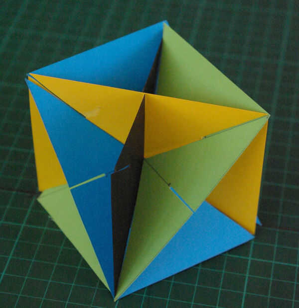 Utilizando dos de los triángulos de ángulo recto del mismo color, deslice la ranura más larga en cada triángulo un par de ranuras opuestas en uno de los rectángulos con el fin de reformar el rectángulo original de los dos triángulos de ángulo recto.