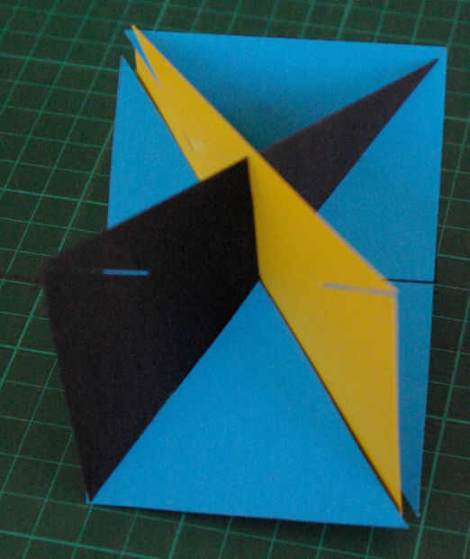 Entonces usando los otros dos triángulos ángulo recto, deslice la ranura más larga en cada uno de estos triángulos en cualquiera de los dos pares restantes de enfrentadas ranuras disponibles en uno de los rectángulos (nota que dos pares de las cuatro ranuras no están disponibles en uno de los pares de rectángulos una vez hecho el primer rectángulo reconstruido) reformar nuevamente el rectángulo original de estos dos triángulos. Cuando inserta el segundo par de triángulos de ángulo recto elige la superficie del triángulo (con o sin líneas dibujadas en él una) para que los triángulos no obstaculizar el primer rectángulo reconstruido.