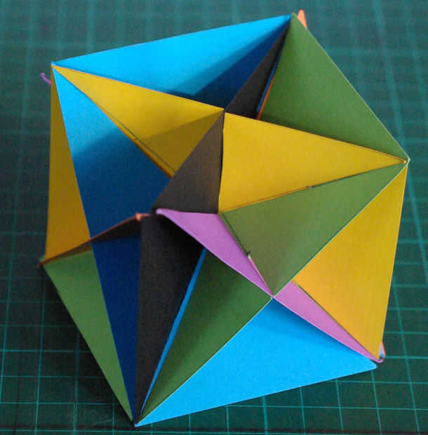 Cada uno de los cuatro triángulos isósceles con las rajas en sus ápices Deslice las ranuras que aparecen en los lados más largos de los rectángulos reconstruidos de los cuatro triángulos de ángulo recto asegurándose de que los triángulos del mismo color están colocados en caras opuestas del cubo construido casi. En este paso cada par de triángulos isósceles del mismo color se inserta en las aberturas en los triángulos de ángulo recto que también tienen el mismo color. La foto muestra dos de los triángulos isósceles que se inserta en las aberturas con una orientación similar a la foto que se muestra en el paso anterior con los cuatro planos de simetría.
