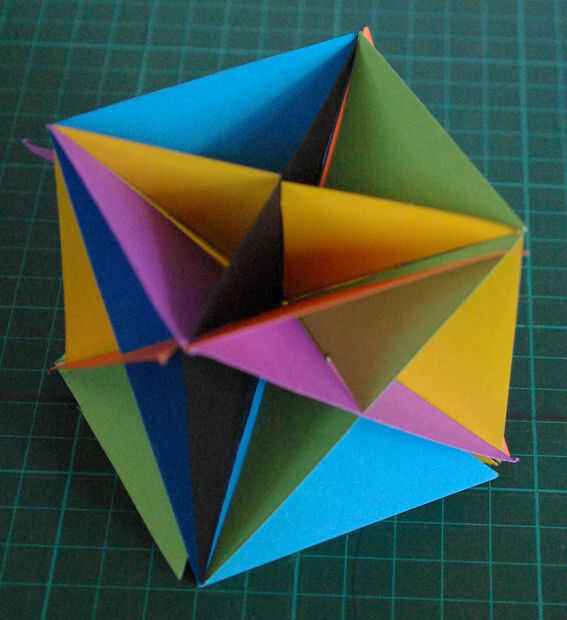 Doblar las dos mitades de cada uno de las cometas a lo largo de las juntas que fueron grabadas juntos en el paso 4 y deslice la ranura hecha en las cometas en las ranuras opuestas del rectángulo que tiene solamente un rectángulo completo originarios en su vértice. Esto se hace de tal manera que cada uno de los colores de los triángulos de la cometa son en el mismo plano que el color de los triángulos isósceles que se inserta en las ranuras como se indica en el párrafo anterior. Otra vez la orientación de la foto es similar al mostrado en el paso anterior.