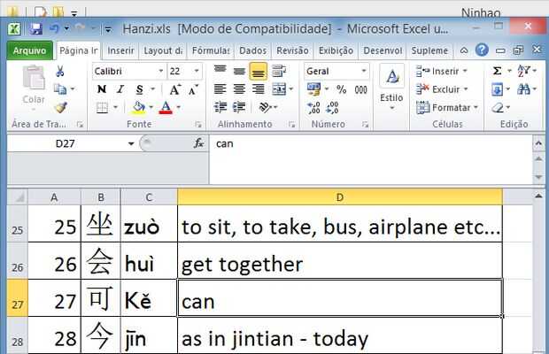 Seleccione una lista de ideogramas que desea aprender. Creo que 30 ideogramas es un buen tamaño para empezar... Anotarlas en una hoja de Excel, uno a continuación del otro y en la columna de la derecha escribir el pinyin equivalente. Si lo desea, en la siguiente columna de la derecha escriba también el significado de los ideogramas.