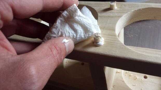 Añadir suficiente pegamento para madera y limpie del exceso después de martillar la clavija en el orificio del piloto.
