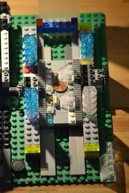 La grada se compone de dos filas de tiras planas y paredes para fijar la dirección de la bandeja del objeto. Un par de engranajes se utiliza para mover la bandeja del objeto y mantenerlo a una altura definida. Especialista en LEGO pudo haber visto una construcción muy similar, en un torneo de Starwars de Lego.