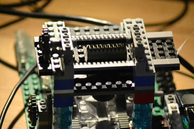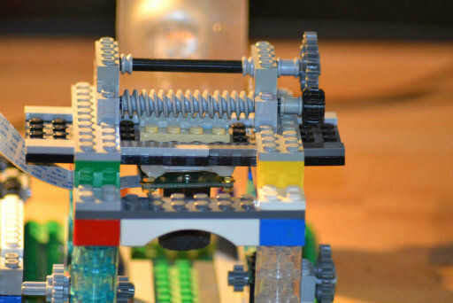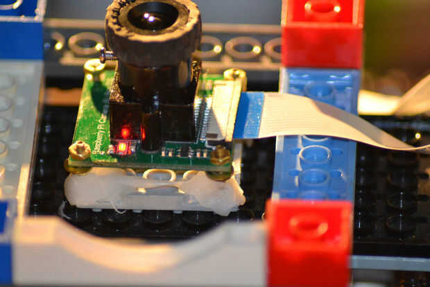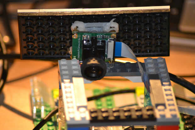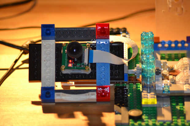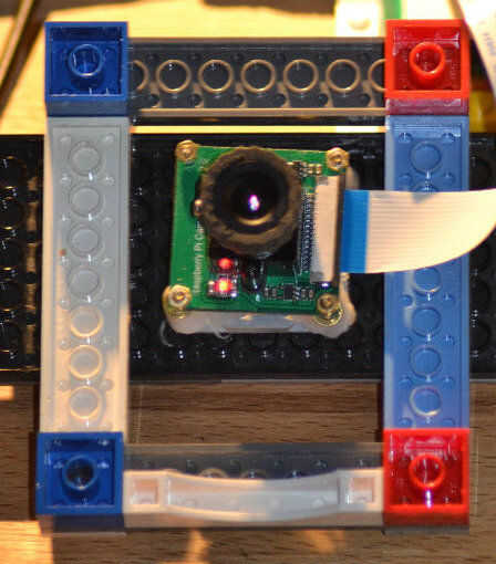 Para ajustar la distancia entre cámara y objeto que usted puede ya sea modificar la longitud de las columnas, agregar o quitar ladrillos de bajo perfil y estándar o usted puede poner algunos ladrillos en el objeto, o ambos. La distancia entre la lente de la cámara B, que tiene una distancia focal de 6mm, y el objeto es de unos 8 mm. La lente de la cámara F, con una longitud focal de 3,8 mm tiene un aumento más pequeño, pero puede moverlo más cerca al objeto.