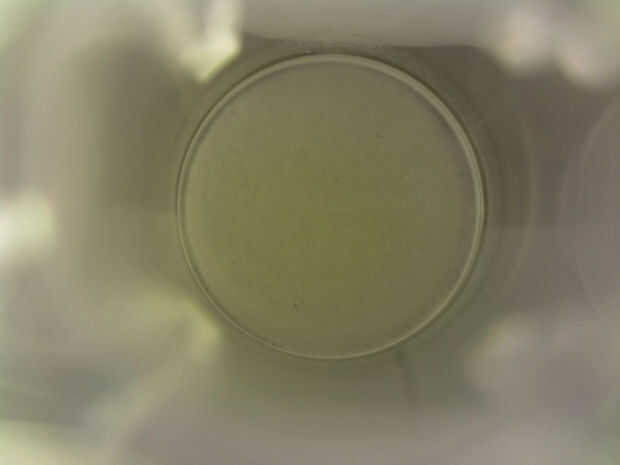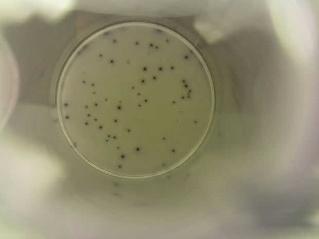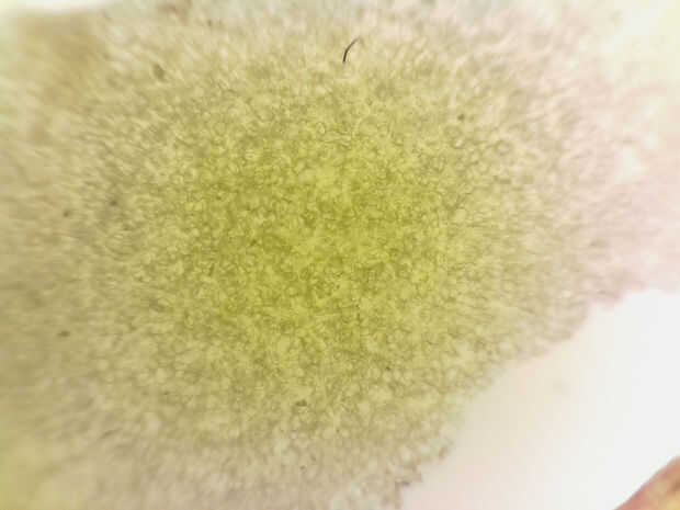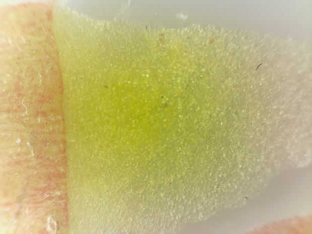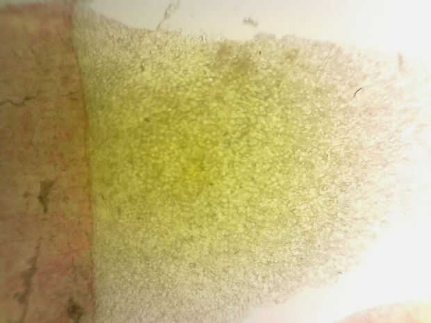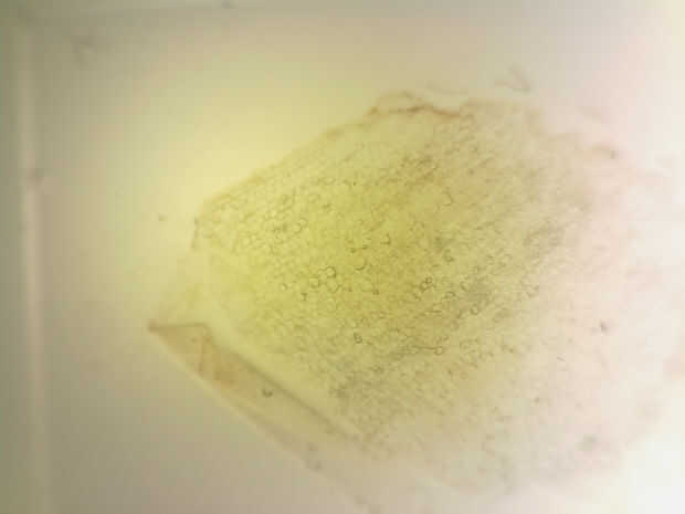 -una tira de 100 μm y las partículas minúsculas, que son las células de levadura. Estos tienen un tamaño de unos 8 μm o dos píxeles