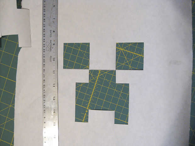 Una vez que su diseño es en el papel de congelador, hacia la superficie de corte. Una regla de metal hace cortar todas estas líneas rectas rápidas y fácil. Con cuidado corte el Creeper ojos y boca y desechar estas piezas. No piezo más allá de las áreas negras.