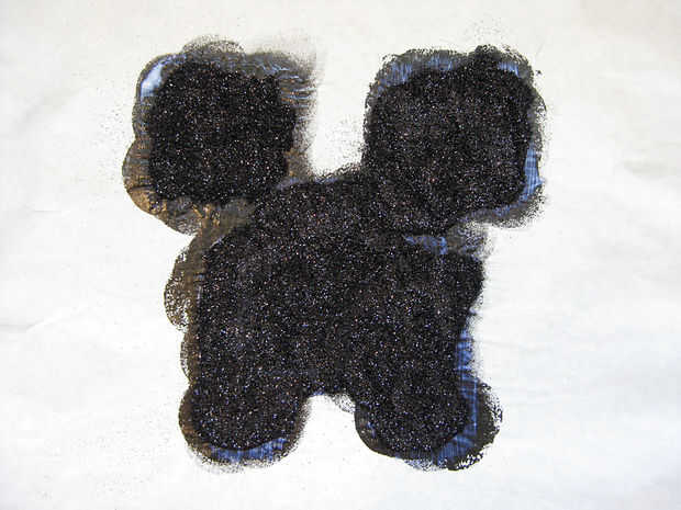 Una vez que el pegamento haya tenido tiempo de configurar, cuidadosamente levante la camisa y quitarse de encima la purpurina sobrante en otra hoja de papel (chatarra hará). Utilice esta segunda hoja para verter el brillo extra a su envase original.