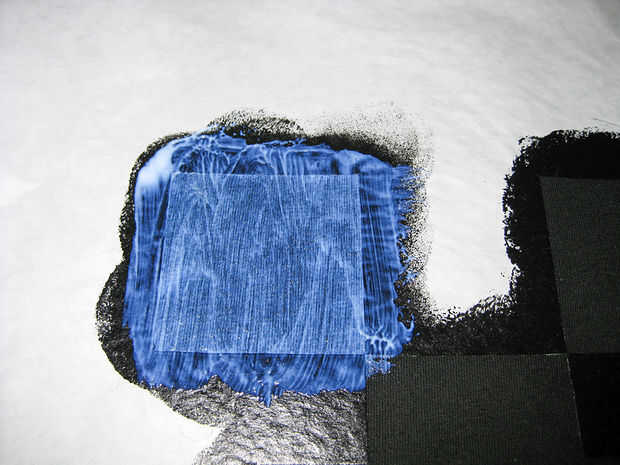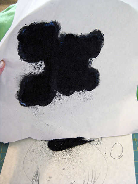 Luego la pintura de la tela ha secado y sistema de calor, poner un poco de su pegamento para tela sobre el plato o papel de desecho. Utilizar el pincel para estarcir para dab y untar pegamento sobre el diseño.