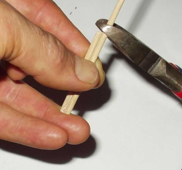 Cuando me decidí por las dimensiones que iba a usar, me corte un palo de la muestra de los dos tamaños y utiliza los palillos como guías para cortar todos los palillos de la misma longitud. Así, todo lo que tenía que hacer era coincidir extremos del palillo, a tope las fresas contra el otro extremo de la palanca de guía y snip.