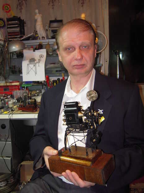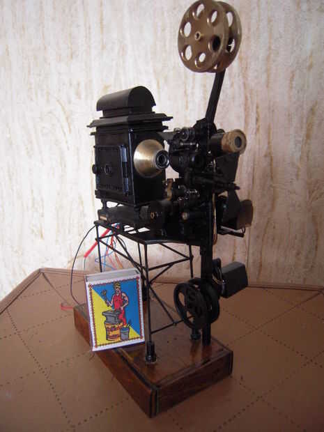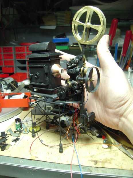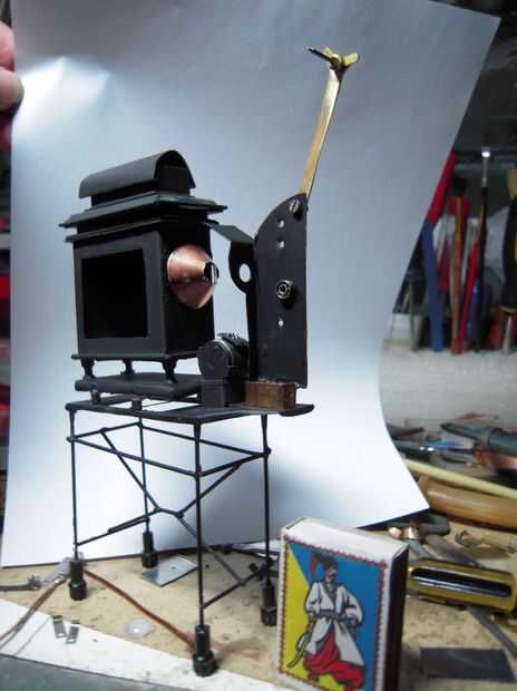 Escala: 1,10 materiales: lata, latón Motor: 6V lámpara - LED de 12 voltios. El formato de la película con un fragmento de la película - 2 mm. Es el que proyector más pequeño del mundo trabaja con anchura de 2 mm de la película.
