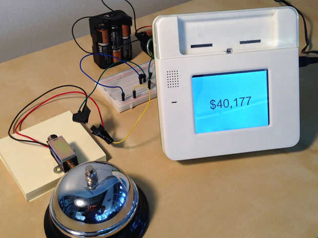 Crear Kinoma se ejecuta una aplicación que raspa periódicamente nuestra página de campaña Indiegogo y muestra la cantidad total aportada en la pantalla. Cuando se realizan nuevas aportaciones, lo físicamente suena una campana golpeándolo con un solenoide.