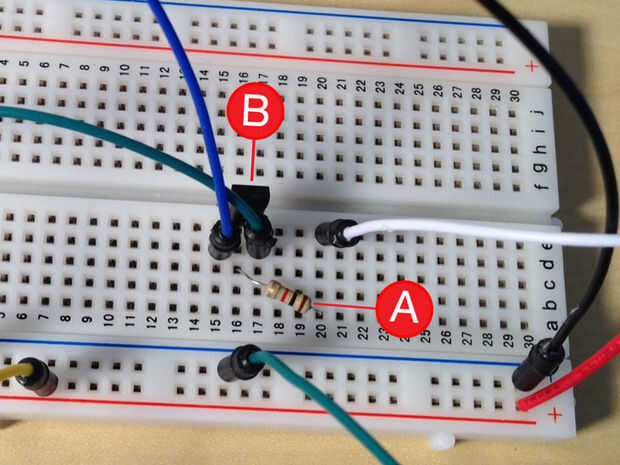 Tenemos dos componentes en el protoboard: un transistor (B) que actúa como un interruptor, que permite crear Kinoma para encender y apagar la fuente de alimentación de alto voltaje al solenoide y resistencia 1 kilohm (A) para limitar el camino de GPIO de Kinoma Create a tierra.