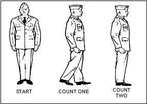 Volver a asumir la posición completa de atención para completar el movimiento facial. Esto debe hacerse colocando el talón izquierdo hacia atrás junto al talón derecho en un ángulo de 45 grados.