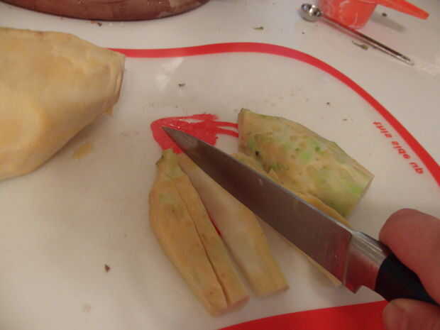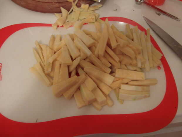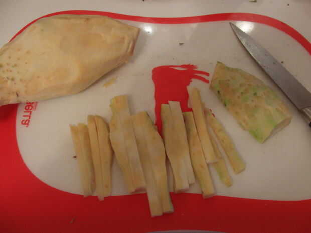 Corte la raíz en matchstick piezas de tamaño. Tratar de hacer las piezas tan uniformes como sea posible para que se cocine en la misma cantidad de tiempo.