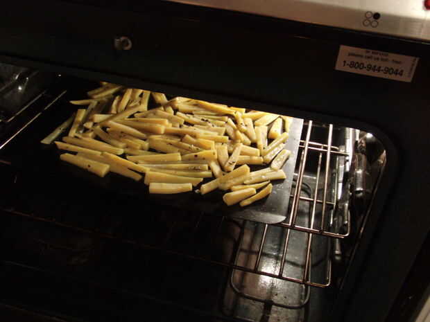 Hornee durante 15 minutos. Cuando estén listas deben ser fácilmente atravesado por un tenedor pero crujiente en la superficie y un poco doradas pero no negro. Tenga cuidado de no sobrecocine las papas ya estarán secos y calcáreos.