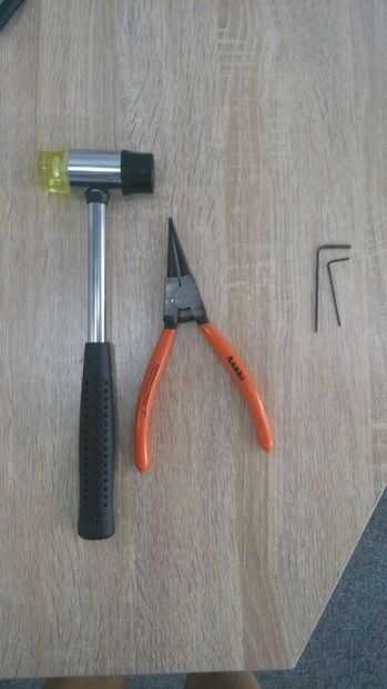 Ver la figura, lo que necesitamos son un martillo, unas pinzas y dos pequeñas llaves allen.
