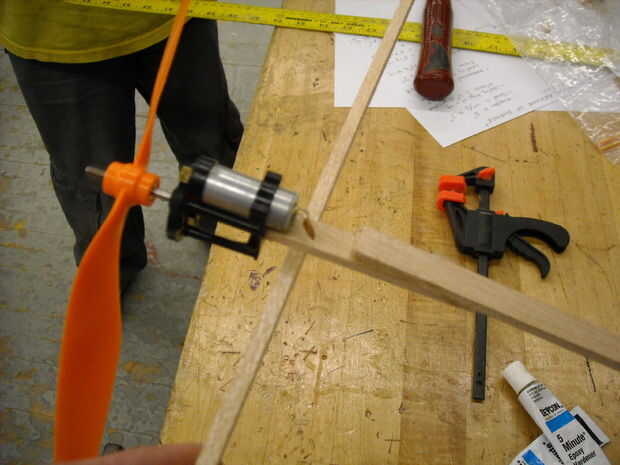Utilice un trozo de balsa dura... 1/8" de 7/16" a 3" largo para el stick de motor. Fije el motor al mismo que sujete el palo a la pieza del fuselaje principal. Debe a un ángulo hacia fuera el motor como en las fotos para que el motor tira del avión hacia el exterior del círculo. Si no el aeroplano volará hacia el centro. Es verdad, su bastante gracioso ver dispersión de niños como el pequeño avión ataca pero permite mantener en el lado seguro.
