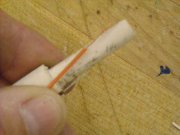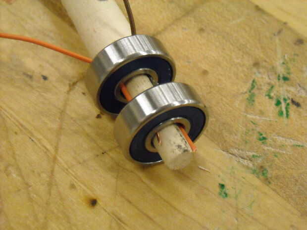 Tira de los cables de 22G trenzado como se muestra y deslice los cojinetes hacia abajo sobre ellos. Revisa las fotos. Los cables con aislamiento deben proporcionar un poco de tensión para que no mueva alrededor. Ejecute estos cables a la clavija de 1/4. 5/16" pasador trabaja bien, también. Si tiene que pegar un poco está bien.