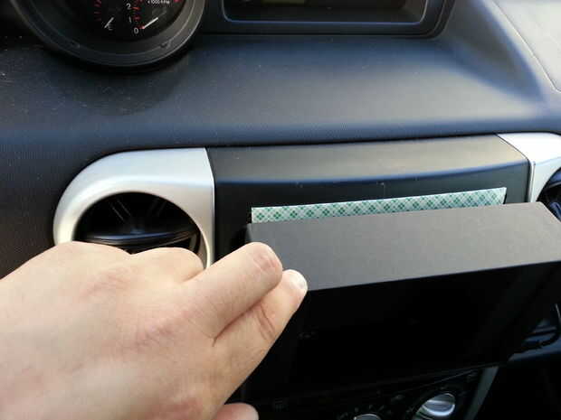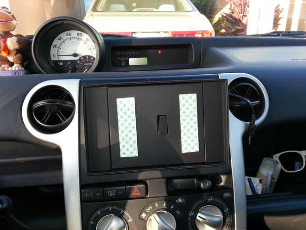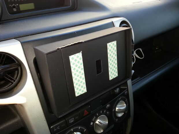 Ahora, quieres tomar dos tiras más de cinta de doble cara y bofetada en esa sección media (la caja más pequeñas desmontable). Esto va a unir a la tableta y actuar como un ancla en la caja más grande... Además, se trata de cómo la tableta va a permanecer en sin caer mientras nuestro disco. Posicioné mi caja en una posición bastante vertical, para que esto es necesario por supuesto. Si tienes más de una posición inclinada, entonces estás en un lugar mejor, pero la tableta todavía caerán con un golpe lo suficientemente bueno. Sin olvidar, cuando quiere sacar la tableta, las diapositivas de la cajita hacia fuera muy fácilmente a mano.