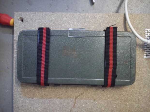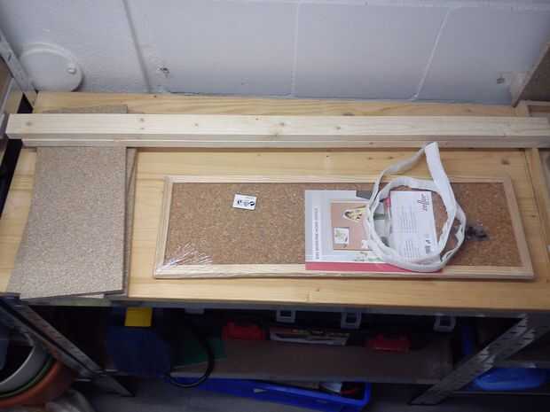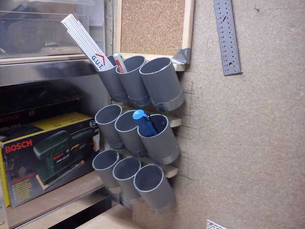 Para guardar tornillos, pernos y tuercas, até 6 contenedores azules de la ferretería al lado derecho de la tabla de la derecha. En el lado izquierdo del tablero izquierdo tengo un poco más creativo. Cortar un tubo de pvc de 9 pedacitos, cerré los extremos de aquellos con varias capas de cinta aislante y un trozo pequeño de espuma y finalmente al tablero. Usé 3 pedazos de madera para montar en un ángulo. Sobre esta sección de almacenamiento de información de taladros, plumas y pequeñas herramientas montara un pinboard para poder fijar esquemas y otros planes de construcción justo en frente de mí.