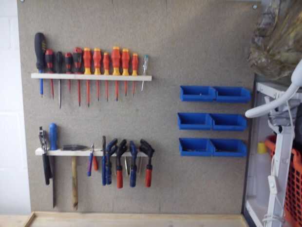 He creado un diseño de cómo quería arreglar mis herramientas. En el tablero de izquierda usé un montón de tornillos y clavos para sierras y llaves. También había doblado unos ganchos de plexiglás y utilizó ésos y dos cintas con velcro fijadas a ellos para reparar mi caja de trinquete en el tablero. Tomé dos piezas de madera con una longitud de 40cm, orificios de tamaños diferentes en ellos y había pegado a la Junta como un soporte para destornilladores, pinzas y abrazaderas.