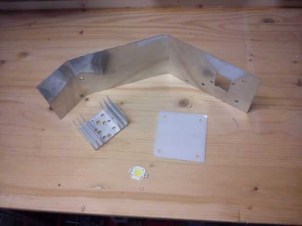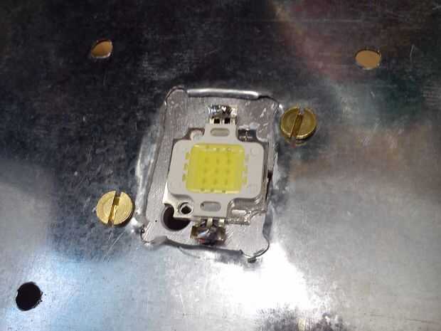 No pasó mucho tiempo en la construcción de dos lámparas de tenía que poner alrededor de las partes. Yo corte una abertura rectangular para el chip en un pedazo de hoja de metal y doblar en una forma conveniente, como se aprecia en las fotos.