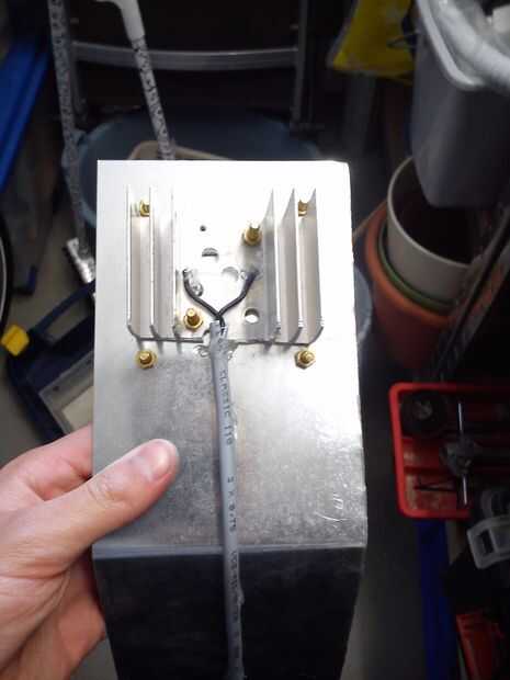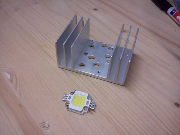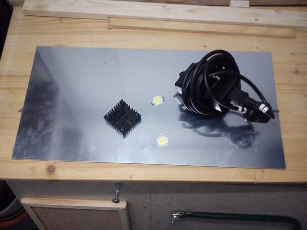 Producir los LED una cantidad significativa de calor, así que puse algunos de enfriamiento pegue en la parte trasera del chip y conectada a un viejo disipador de calor. Reconocí más adelante, que los chips todavía calientan bastante porque mi disipadores de calor no son lo suficientemente grandes, así que puse un ventilador pequeño ordenador encima de las lámparas, activamente enfriarlos. Para encender las luces, usé una fuente de alimentación 12V 5A que os adjunto en la parte posterior de la cremallera de la herramienta.