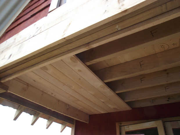 Yo también con paneles dentro del "techo de patio" con ranura y lengüeta. y en los plafones en la parte inferior de las vigas frontales y laterales y adjunto la segunda pieza de alero (más 2 en el otro extremo de la caseta)