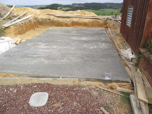 La base de aproximadamente 1.5-2 metros cúbicos de concreto que me diera un 18 pies x 12 pies 4 pulgadas de profundidad.
