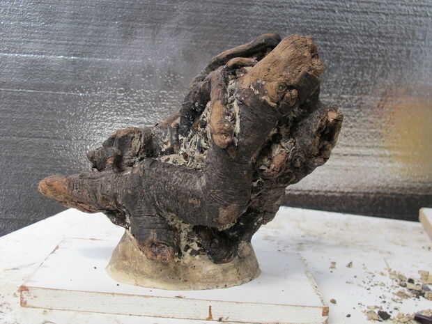 Después encontré el driftwood, la lavé apagado quitando parte del lodo que le daba mucho carácter. Quizás la parte más difícil de la operación era restaurar el barro con plastilina para volver al objeto su carácter original y que sea viable para la fundición en vidrio.