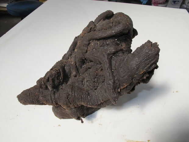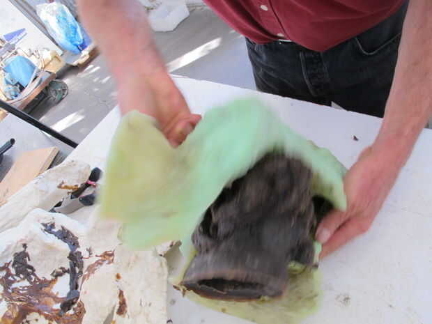 Después de que la cera se ha enfriado un poco y una piel gruesa se haya endurecido en lo que es la parte inferior, expusieron superficie del objeto, a través de la piel, que debería ser casi 1/2 pulgada de espesor, cortar la cera fundida a continuación en un círculo dejando 1/2 pulgada de pared en el molde. Derramar la cera todavía fundida, dejando una pared gruesa para toda la pieza, que luego será hueco. Deje que la cera completamente fría. Nos gusta poner el molde entero en la nevera o incluso el congelador, así la cera es muy difícil que el molde viene aparte.