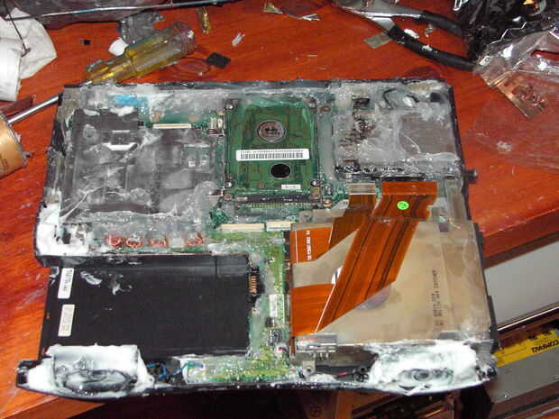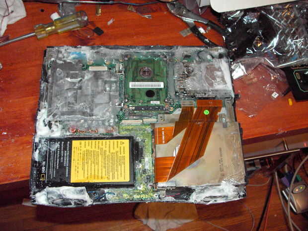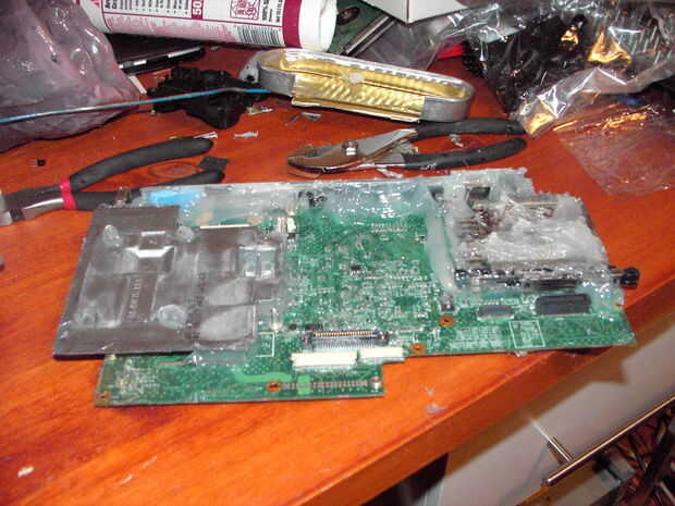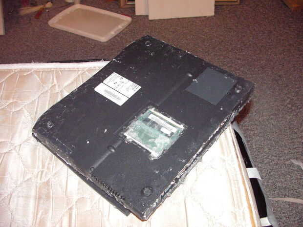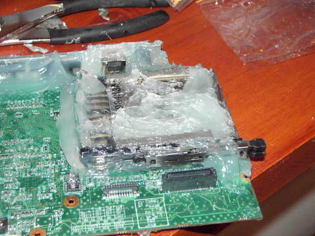 Ahora, empezar a reasembling la computadora portátil. Comience con las partes en el medio y su forma de trabajo hacia fuera. Asegúrese de sellar la pieza a la mesa y puso algunos silicio alrededor de la parte superior de la daughterboard o el dispositivo. Seguir trabajando rápidamente pero cuidada como silicio tiende a secar.