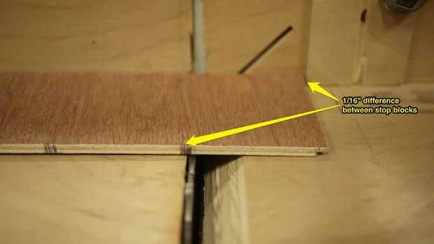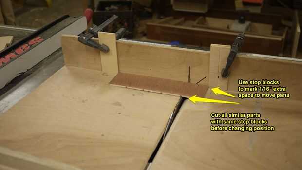 Para asegurarse de que cada corte era el mismo, configurar dos cuadras de parada en mi trineo del crosscut. Me comenzó con una pieza de arriba - poner el borde más lejano de la dado contra la hoja de sierra, luego fijar un tope. Luego había empujado la pieza superior más 1/16" hasta el otro borde de la ranura fue alineado con la hoja de sierra, luego reprimieron el tope. Esto me dio 1/16" de sala meneo entre los bloques de la parada de dos. Para cada articulación, presiona la pieza contra un tope, un cortado, entonces presiona contra el tope y cortar otra vez.