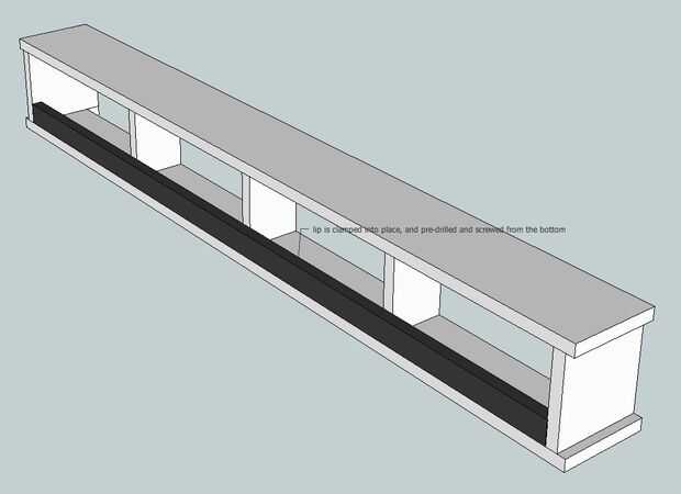 Un problema con un gabinete poco profundo como esta es que todo lo que pones en él podrían caerse inmediatamente. Así que decidí utilizar una longitud de 1 x 3 para crear un labio en la parte inferior para evitar. Otra vez, después de marcar la tabla cortar para que quepa y sujeta el tablero resultante en el lugar. La perforación y atornillado en la parte inferior terminado esta parte.