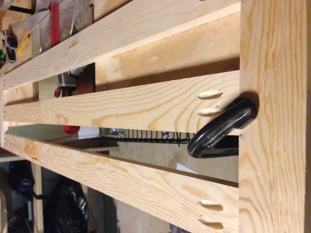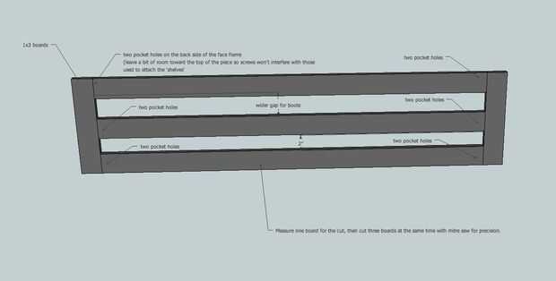 Utilizando la plantilla de agujero de bolsillo, perforé dos agujeros de ocultación en cada extremo de las juntas de centro. Utilizar los tornillos de bolsillo para formar el marco exterior y luego ha añadido una tabla en el medio para completar el marco frontal. Esta Junta Central fue colocada con el fin de dejar un espacio más amplio entre los tableros de medios y superior que entre las juntas medio e inferior; botas gruesos va finalmente en el espacio superior y más zapatos en el espacio inferior.