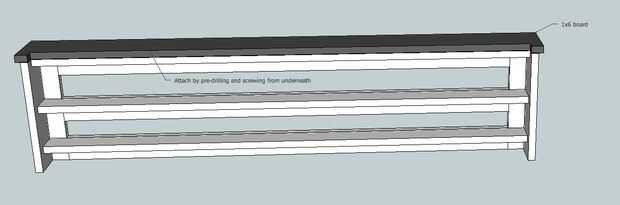 Anywhoo, después de comprobar el ajuste de la muesca en los estantes, lo atornilló a los estantes de abajo del estante superior.