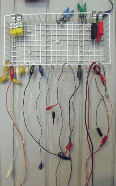 Cocodrilo clips clip a los alambres de la cesta. Otros conductores simplemente están colgando de la cesta.