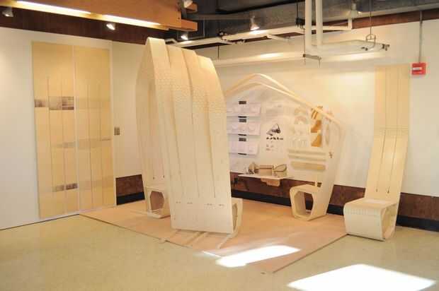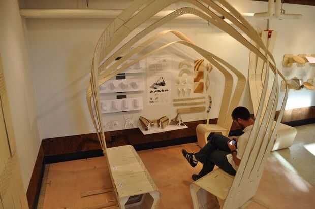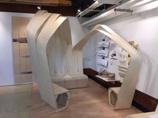 Después de probar el número de especies diferentes, al final decidimos utilizar contrachapado de abedul por su alto módulo de elasticidad o capacidad de flexión. contrachapado de abedul de 1/4", compuesto por 5 capas de chapa del sólido (3 paralelo y 2 perpendicular a la dirección de la flexión), resultó para ser ligero y lo suficientemente flexible para el pabellón pero pesado sólido suficiente ser manipulada para la composición de la silla. Además de la 1/4" madera contrachapada, el sistema material se compone de vuelta encolados y tornillos metálicos que actúan como sujetadores mecánicos para estabilidad adicional.