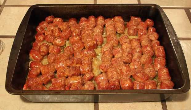la comida es sencilla, abundante, barato y absolutamente deliciosa (hace la casa huele genial, demasiado). Te hace falta:1 - 2 libras de acoplamientos de la salchicha italiana, cortar por la mitadtomates 2 latas (14.5 oz) cortada en cubos2 latas (15,