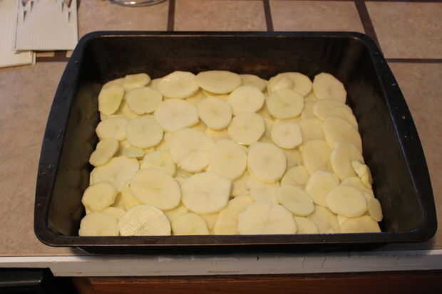 capa en sus rebanadas de la patata para cubrir el fondo de la cacerola (puede usted pensar una mejor manera de empaparse de todo el sabor que gotea a través de las capas?)