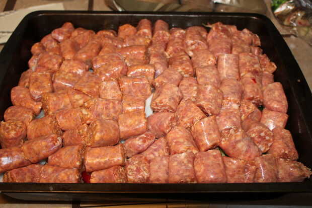 y ahora... la pieza final del rompecabezas... el chorizo. No tenga miedo de meter las piezas firmemente, recuerda habrá contracción durante la cocción.