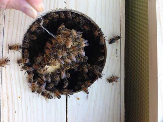 ¿Por qué es la reina en una jaula de su propia? Resulta que ella nunca ha conocido a las abejas obreras a su alrededor, y porque son desconocidos, las abejas obreras necesitan tiempo para acostumbrarse a sus feromonas, antes de que le aceptan como su nueva reina madre. Los apicultores llaman paso "introducción" o "introducción de la Reina". Introducción generalmente toma un par de días, así que mientras tanto la reina cuelga hacia fuera con seguridad en su propia jaula pequeña. Yo llamaré a la reina varias más veces, pero por ahora sólo recuerdan que tener una reina sana feliz es la parte más importante del proceso.