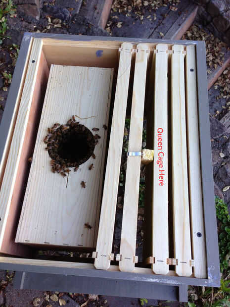 Colocar a la reina en su jaula entre bastidores en el centro del grupo, colgando de la barra superior de un fotograma del clip. Si no hay ningún clip, pues sólo la cuña la jaula reina entre dos marcos scooched juntos firmemente. Asegúrese de que el lado de la malla de la jaula tiene un montón de aire.