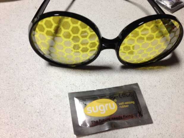 Sugru es un caucho de la uno mismo-ajuste para fijar, modificar y mejorar cosas.  Se moldea como plastilina, adhiere a casi cualquier cosa y se convierte en un caucho de silicón flexible, fuerte durante la noche.  Viene en varios colores y es ideal p