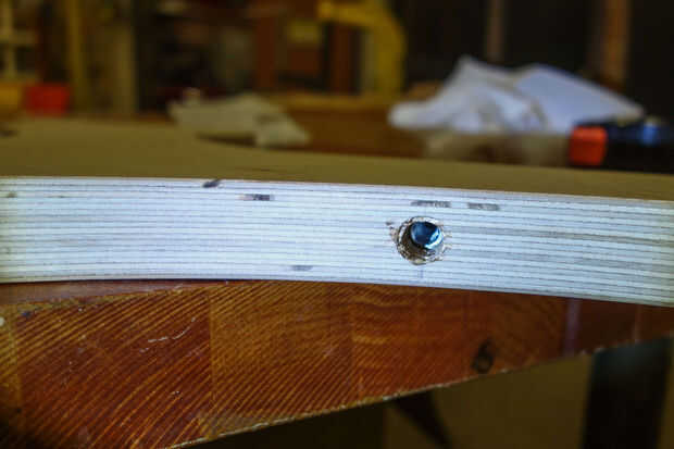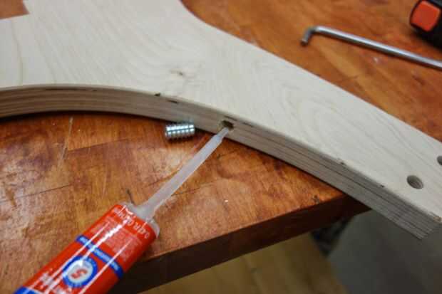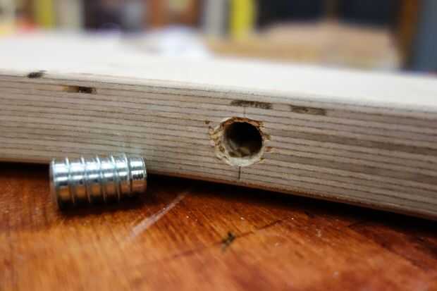 Los cuatro insertos roscados en la lista de materiales se utilizan para sujetar el resto del asiento y del pie. Cada parte movible del hilo de rosca en el orificio hasta la profundidad debida. Para el asiento, la parte superior del relleno debe quedar al ras con el borde de la madera contrachapada. Para los agujeros de la manija y el reposapiés, el inserto debe ser enhebrado en cuanto sea posible. El propósito de hacer esto es cortar los hilos de rosca en la madera antes de que las inserciones se pegan en su lugar