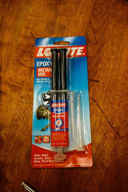 Ahora, quite los insertos. Aplique una gota de epoxy en cada agujero, luego vuelva a instalar los insertos (Recuerde, asiento posición - ras con la superficie, posición de la manija/reposapiés - hasta el fondo del agujero). Ayuda a usar epoxy que tiene una boquilla de mezclado; facilita aplique la gota de epoxi en el agujero.