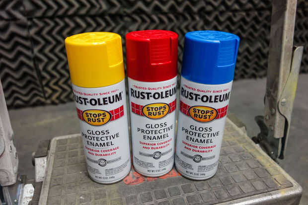 Pinté los corredores de pie, manijas y asiento. Consiguieron unas capas finas de imprimación, seguido de una capa superior de pintura roja, azul o amarillo. Utilicé pintura en spray para un acabado uniforme, pero la pintura con un cepillo funcionaría muy bien así.