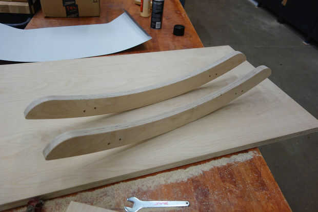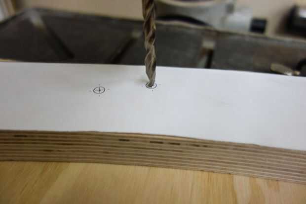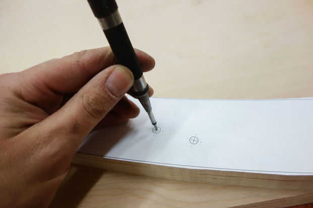 Después de hacer los cortes ásperos, es hora de hacer la configuración fina. Antes de hacerlo, sin embargo, seguir adelante y usar un punzón para marcar los orificios mientras que el patrón todavía se une (pueden aflojarse durante el lijado). Luego, perforar a través con un 1/4" bits (taladro recomendado)