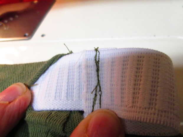 Cuando tienes ambos extremos del elástico fuera del agujero, estén planas todo el camino a través de la carcasa, se les superponen alrededor de 1/2 pulgada y coserlas juntas.  Que en la abertura y coser la abertura.